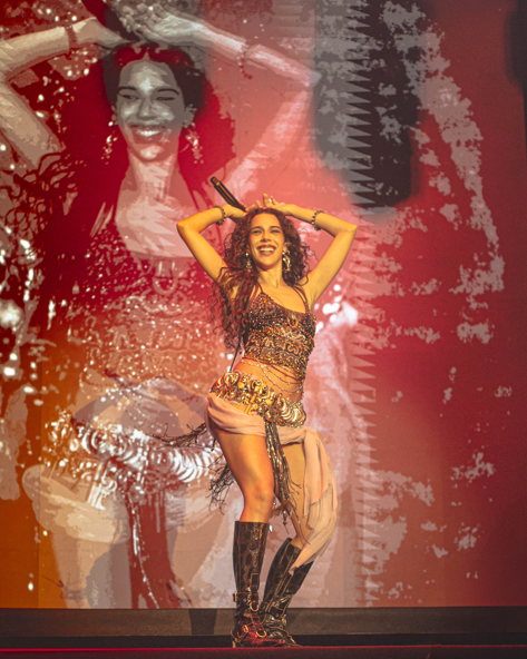 Ao entrar no palco, Marina Sena comprova que a música é divina. Com um arranjo na cabeça e um pedestal à sua frente no palco, a artista se coloca em uma posição graciosa e impõe uma dominância refinada diante do público. E é em alto volume que ela é recebida pelo público que canta cada palavra das faixas “Coisas Naturais” e “Numa Ilha”.