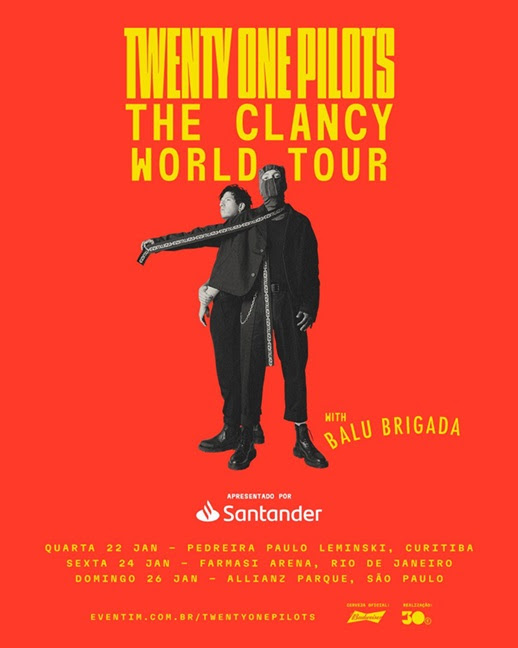 Há poucos dias do início da maior turnê do Twenty One Pilots pela América Latina, a dupla anuncia Balu Brigada como banda de abertura para suas apresentações no Brasil. A The Clancy World Tour começa no dia 16 de janeiro em Bogotá, Colômbia, e chega ao Brasil com shows em Curitiba (22 de janeiro, Pedreira Paulo Leminski), Rio de Janeiro (24 de janeiro, Farmasi Arena) e São Paulo (26 de janeiro, Allianz Parque). Os ingressos estão à venda pelo site Eventim, com descontos exclusivos para clientes Santander.